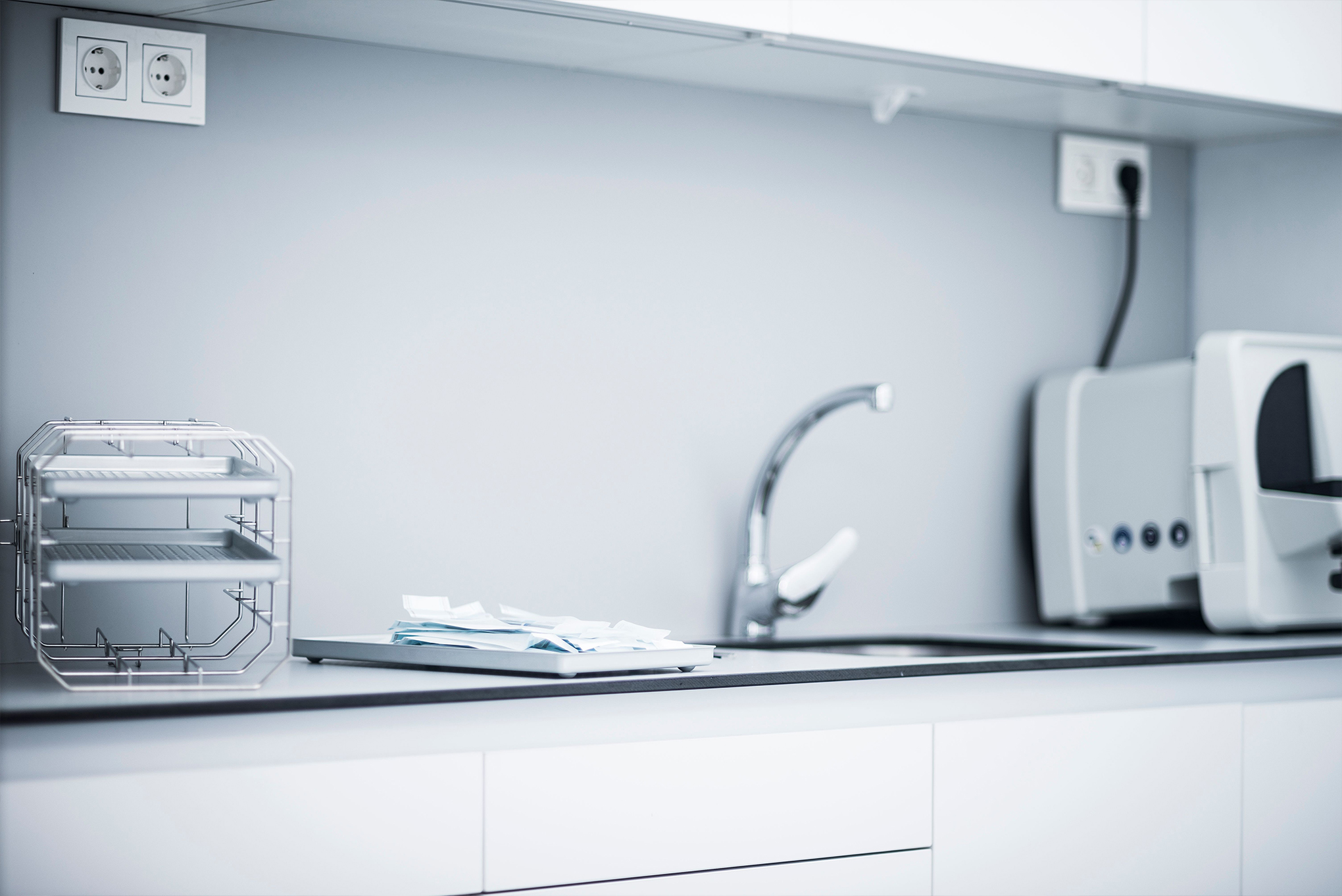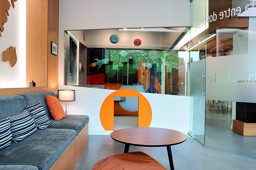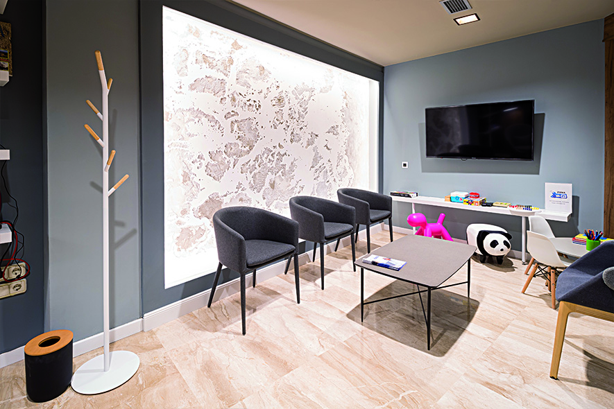 También la clínica ofrece una sala relax para sus pacientes y tema principal y fundamental es la elección de no poner mostrador alto en recepción y sí mesas de trabajo y atención bajas que resume muy bien la filosofía de los propietarios y de toda la plantilla: el trato humano y muy cercano.