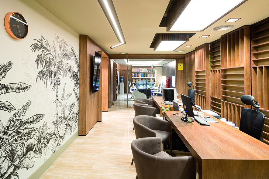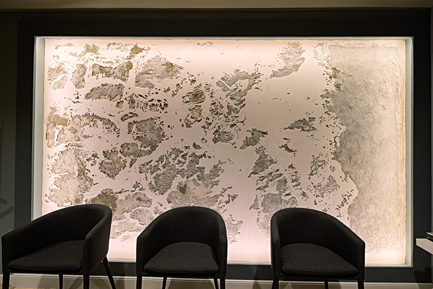 El decorador destaca como una gran suerte el haber podido contactar con la pintora Ira Torres para la realización de dos murales, uno en recepción, negro sobre beige recordando a los murales chinoiseries tan utilizados en el siglo XVIII y principios del siglo XIX y otro que es la sensación de la clínica realizado sobre pared de mortero, enfoscada en blanco posteriormente y cincelando y esculpiendo a golpe de martillo y cincel. El resultado es espectacular.