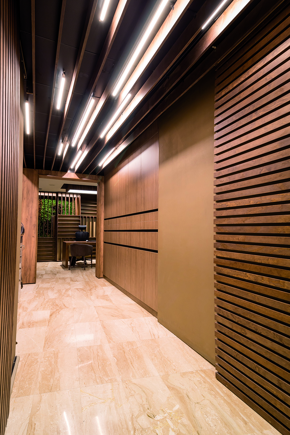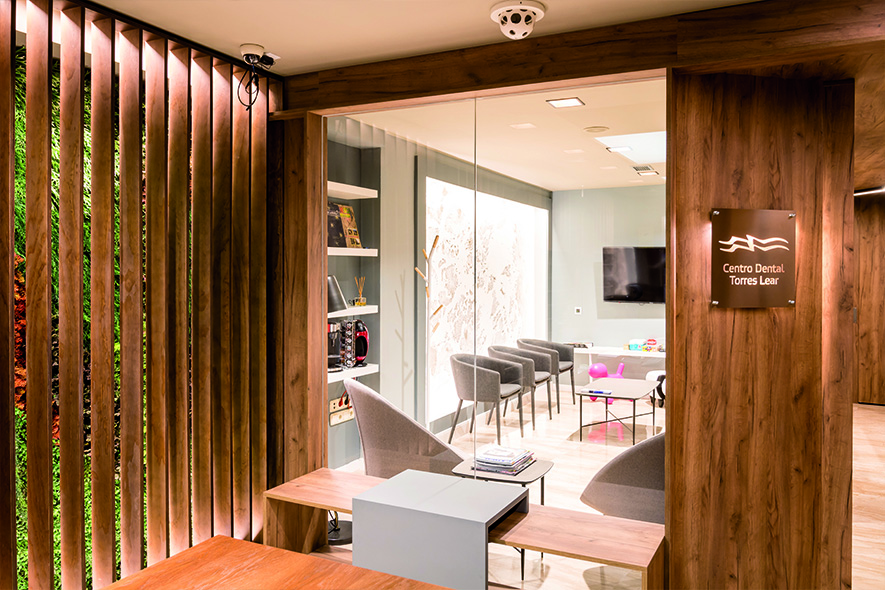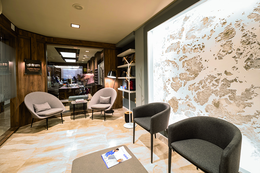 La idea es huir del color blanco tan usado en clínicas dentales y optado por toda gama de los topo y visones en claro, medio y oscuro, según zonas. Otro punto principal es el suelo de mármol travertino que se realiza de manera espectacular con los revestimientos en madera color tabaco. Para el mobiliario se ha optado por unas piezas muy al estilo nórdico refinado pero muy elegantes, teniendo especial atención en la comodidad, tanto para el personal que trabaja allí, como para los propios clientes. Con la nueva remodelación se ha ampliado la sala de espera incluyendo una zona para los más peques y haciendo mucho más abierta a través de grandes ventanales y que los pacientes no se sientan como encerrados.
