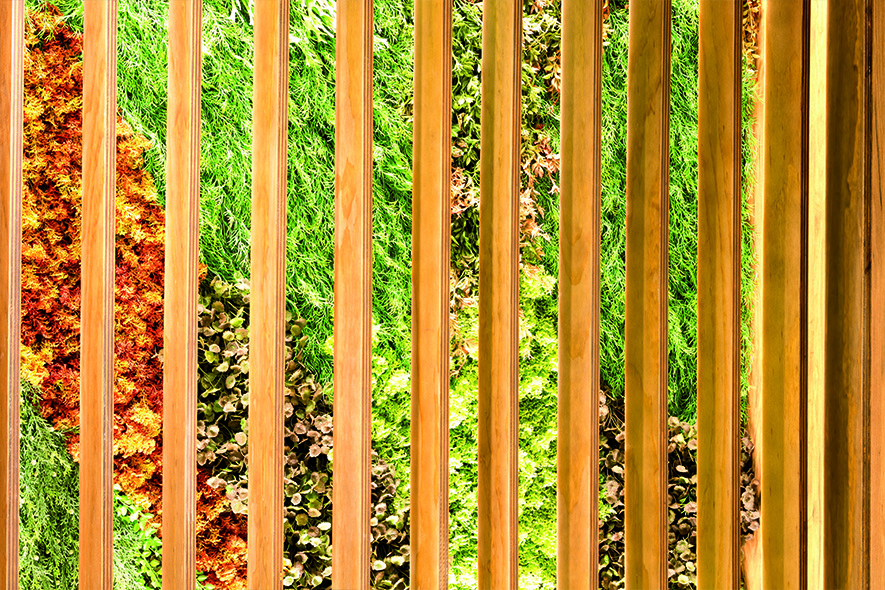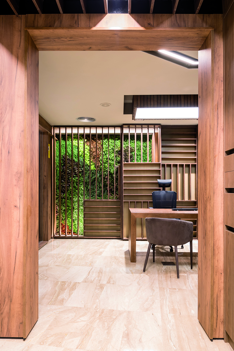 También se ha construido una zona de coworking para el personal para reuniones, cursos o para zona de descanso y comida, donde el decorador ha diseñado una maxi mesa donde se une mesa alta con taburetes más informal, un pequeño jardín zen donde están escondidos todos los equipos informáticos y una ala sin patas para trabajo.