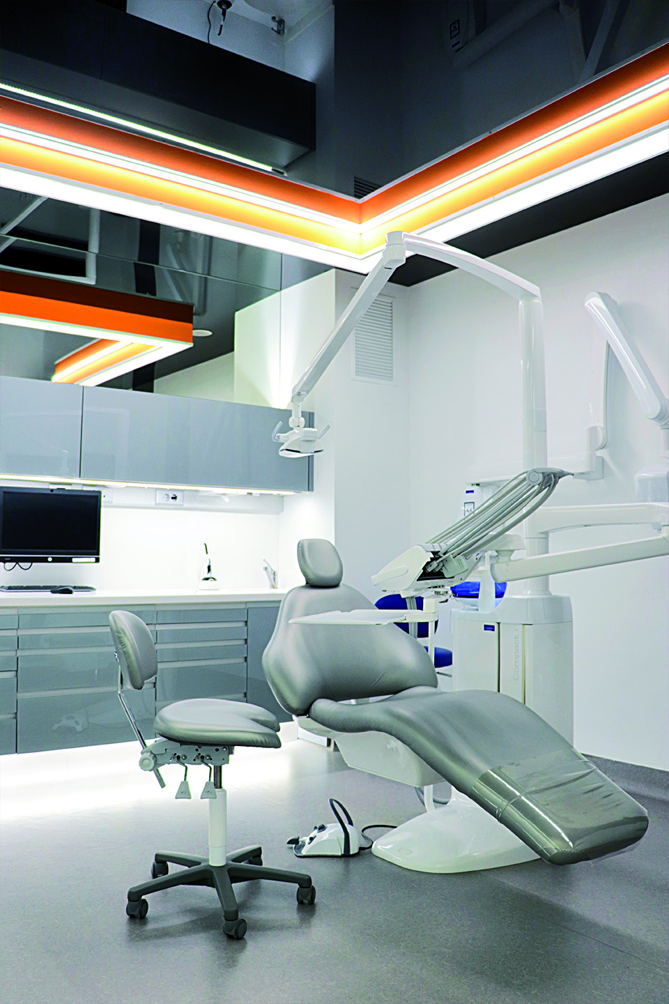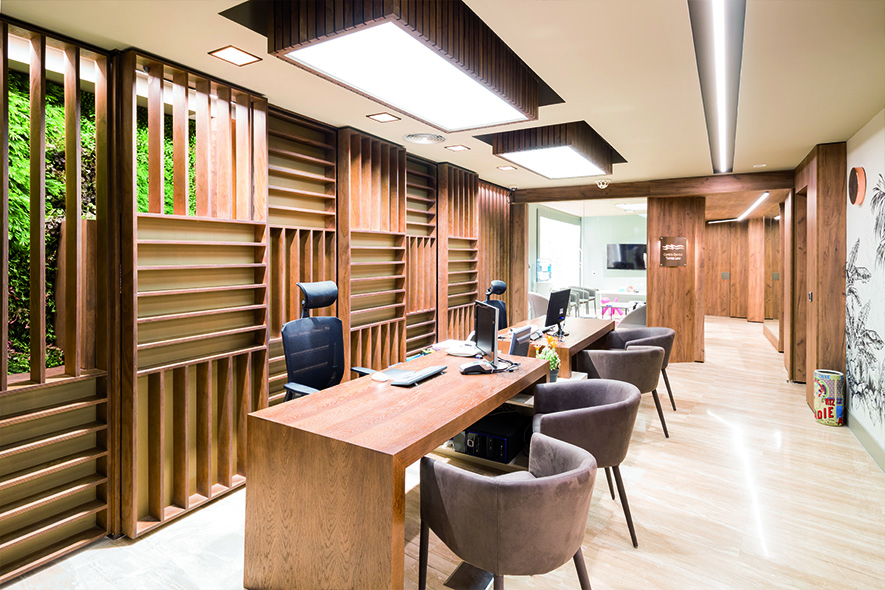 La reforma y diseño de esta clínica se realizó en junio de 2016 y como ampliación y expansión de la ya existente para ofrecer a sus clientes una nueva imagen donde se unen tecnología y diseño. Nada más entrar a la clínica nos recibe el eslogan "tu sonrisa cambia el mundo" con un gran jardín vertical de plantas naturales preservadas donde le puse en el techo un espejo haciendo aguas. El reflejo del jardín distorsionado nos recuerda a el de un estanque en un bosque maravilloso, así como el mostrador de recepción diseñado como tres troncos entrecruzados atravesando la columna con cajas de luz de madera de distintos tamaños y volúmenes a modo de un gran árbol, presidiendo y diseccionando todas las estancias. La sala de espera la dote de biombos de madera móviles para dejar pasar la luz a nuestro antojo, así como una gran bancada con un mural retroiluminado de madera que representa un gran mapamundi, en referencia a el eslogan de la clínica. En definitiva, he querido integrar elementos muy naturales como la madera y las plantas a unos espacios clínicos en los cuales no estamos muy acostumbrados.